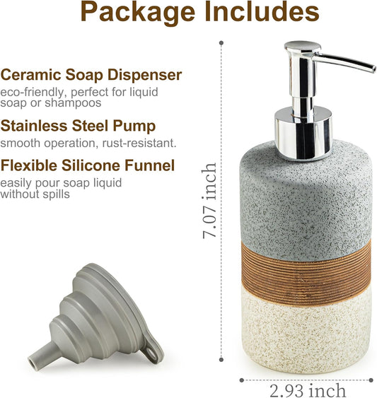 Ceramic Soap Dispenser Set for Hand Soap, Shampoo, Dish Soap, Conditioner, Bathroom & Kitchen, Stainless Steel Pump, Includes Silicone Funnel, 12 Oz, Non-Slip, Elegant Kitchen Decor, Gray