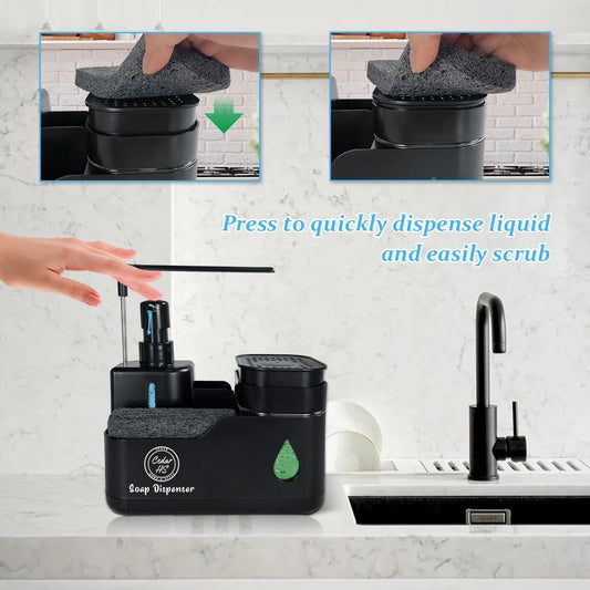Kitchen Soap Dispenser Set with Sink Caddy-Hand and Dish Soap Dispenser with Sponge,Crevice Cleaning Brush,stailess Steel Scrubber, Sponge and discloth Holder 5-in-1 Organizer Set (Black)