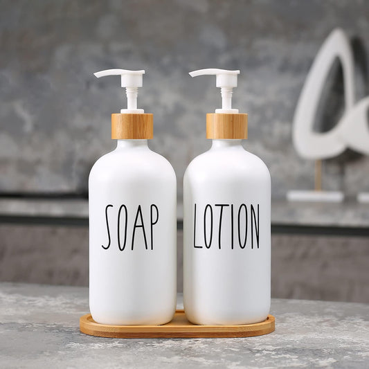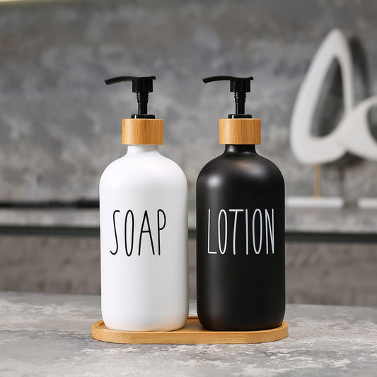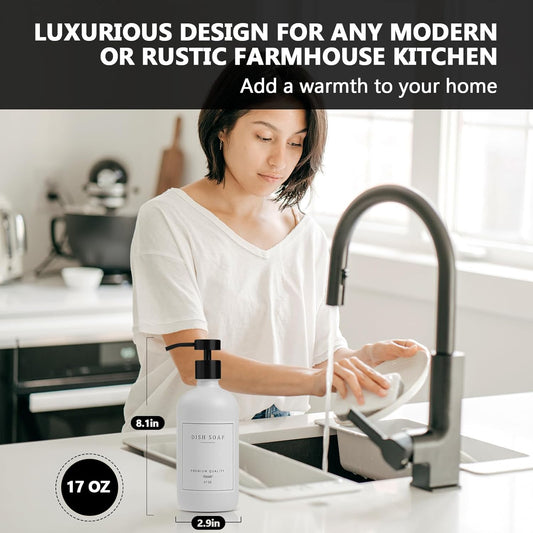 Kitchen Soap Dispenser - Hand and Dish Soap Dispenser Set, Bathroom Glass Soap and Lotion Dispenser with Pump, Tray, 14 Waterproof Labels, Set of 2 White Bottle/Black Pump-pd