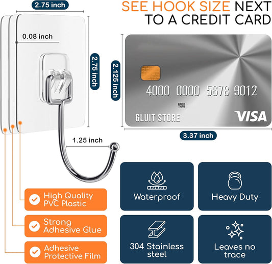 GLUIT Adhesive Wall Hooks for Hanging Heavy Duty 22 lbs Hooks for Walls No Damage, Towel Sticky Clear Hook, Waterproof, Home, Bathroom, Kitchen, Office, and Outdoor 6 Pack