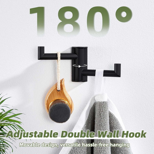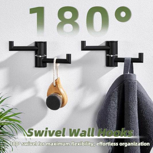 APLusee Swivel Towel Hook 2 Arms Matte Black, 304 Stainless Steel Bathroom Double Towel Holder, Folding Robe Hook Wall Mounted