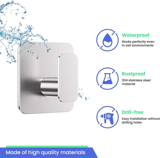 Silver Hooks for Hanging Heavy Duty, Adhesive Hooks for Shower, Bathroom, Kitchen, Robe, Towel, Coat, Waterproof & Rustproof Hook for Walls No Damage, Stainless Steel Sticky Hook - 4 Pack
