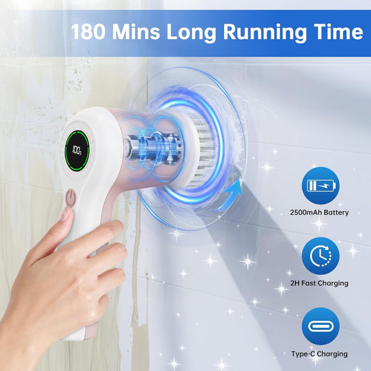 Electric Spin Scrubber, Cordless Shower Scrubber with Battery Level Display, 2 Speeds Electric Scrubber for Cleaning with 6 Replaceable Heads, Cleaning Brush for Bathroom/Sink/Window