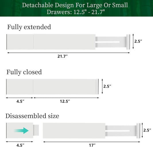 RAPTUROUS Adjustable Drawer Dividers 4 Pack, 2.5" High, 13-22" Long, Dresser Drawer Organizer for Bedroom, Closet, Kitchen, Nursery, Office, Strong Hold, Soft Foam Edges, White