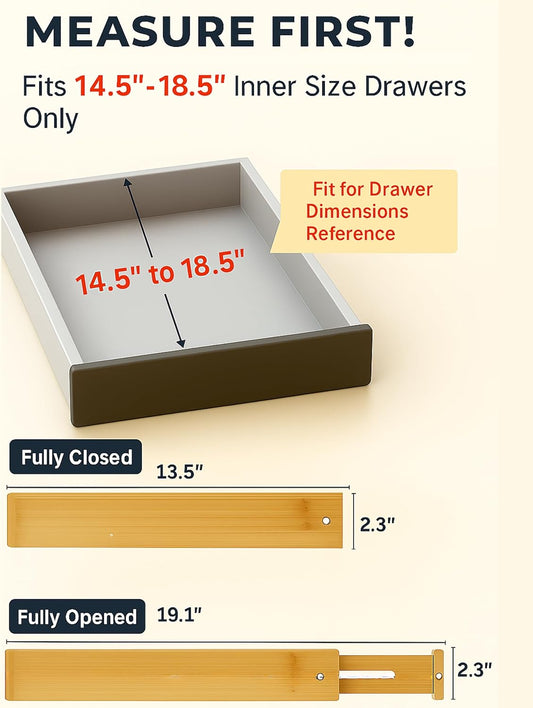 4 Pcs Bamboo Kitchen Drawer Dividers Large 14"-19", Spring Loaded, Works in Kitchen, Adjustable Drawer Organizers, Dresser, Bathroom, Bedroom, Drawer Desk, Office