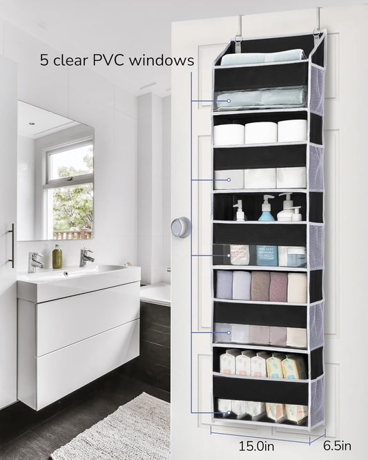 ULG 1-Pack Over Door Organizer with 5 Large Pockets 10 Mesh Side Pockets, 44 lbs Weight Capacity Hanging Storage Organizer with Clear Window for Bedroom Bathroom Kitchen, RV, Camper, Clear