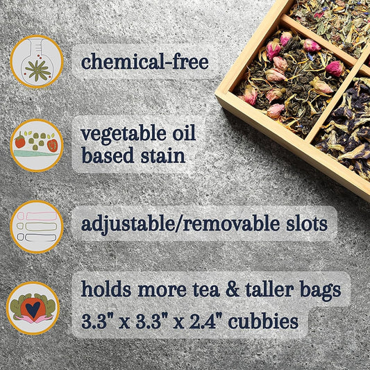 Bamboo Tea Organizer Box Chemical Free Eco-Friendly Big, Tall, Adjustable Cubbies Natural Wooden Storage Chest (4-Slot Square 7.4" x 8.1" x 4.2" Tea Time)