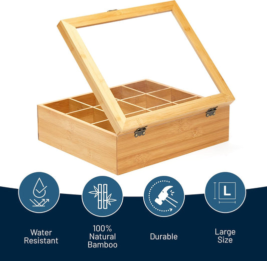 RoyalHouse Big Natural Bamboo Tea Storage Organizer with Clear Acrylic Top Window, 12 Compartments Eco-Friendly Tea Bag Holder, Multi-Functional Storage Box