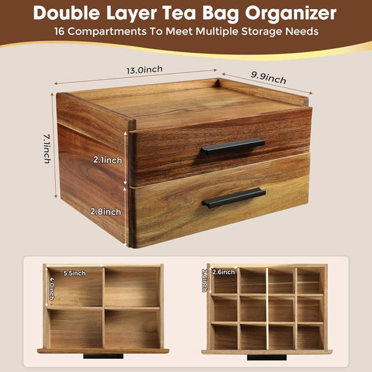 Double-Drawer Acacia Wood Tea Bag Organizer - Tea Box with Drawer, Tea Accessories for Tea Organizers and Storage Box, Tea Station Chest Caddy for Countertop Cabinet Office (16-Compartment, Gift Box)