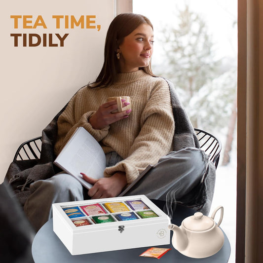 Bambüsi Tea Bag Organizer - Bamboo Tea Box Organizer Storage Box, Tea Bag Holder with Acrylic Window, Magnetic Lid Keeps Tea Bags Fresh - Tea Organizer Caddy (Tea Not Included) Christmas Gift - White