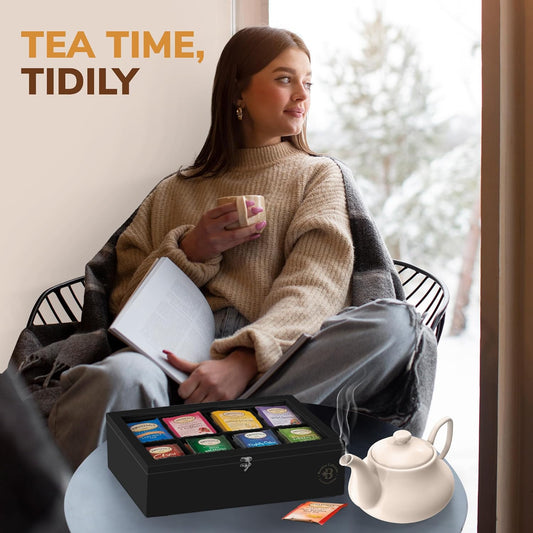 Tea Box - Luxury Wooden Tea Bag Organizer from The Apace Premier Collection - 8 Compartment Tea Storage Chest Container - Elegantly Handmade w/Scratch Resistant Window