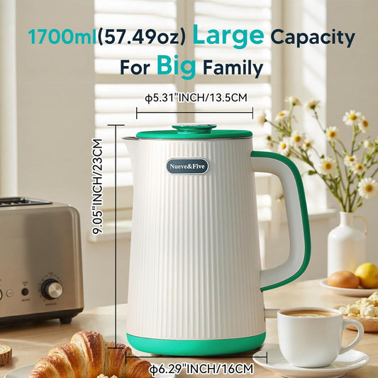 Nueve&Five 1.7L (57oz) Large Electric Kettle Perfect for 7+Cups of Tea and Coffee,2 quarts Double Wall Big Electric Tea Kettle,Auto Shut Off,1200W Hot Water Kettle Electric -Green