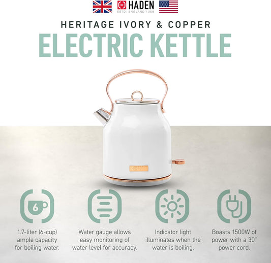 Haden Heritage 1.7 Liter Stainless Steel Electric Kettle, Hot Water Kettle with 360-Degree Base and Auto Shutoff, Ivory & Copper