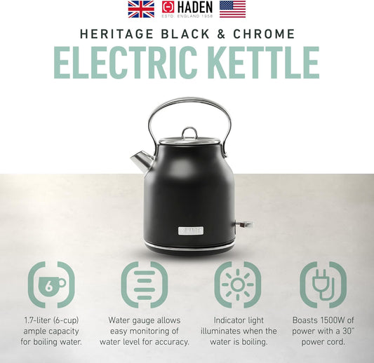 HADEN Heritage 1.7 Liter Stainless Steel Electric Kettle, Hot Water Kettle with 360-Degree Base and Auto Shutoff, Black & Chrome