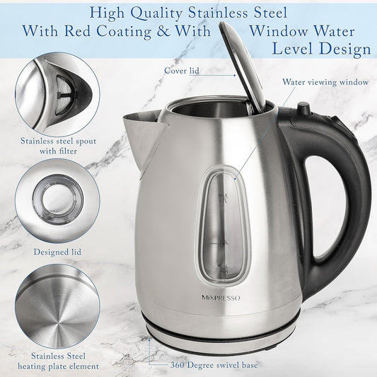 Mixpresso Electric Kettle Temperature Control, Hot Water Kettle Electric, Cordless 1 Liter Capacity, Keep Warm & LED Indicator, Auto-Shutoff, Boil-Dry Protection, Stainless Steel Electric Kettle