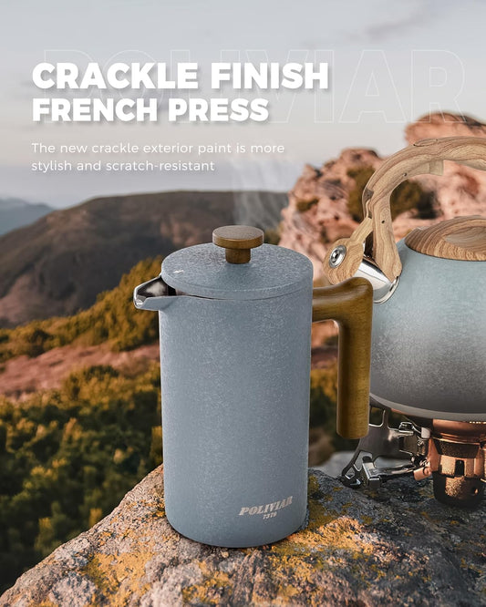 POLIVIAR French Press Coffee Maker, 34 Ounce Coffee Press with Real Wood Handle, Double Wall Insulation & Dual-Filter Screen, Food Grade Stainless Steel for Good Coffee and Tea JX2023-FPLU