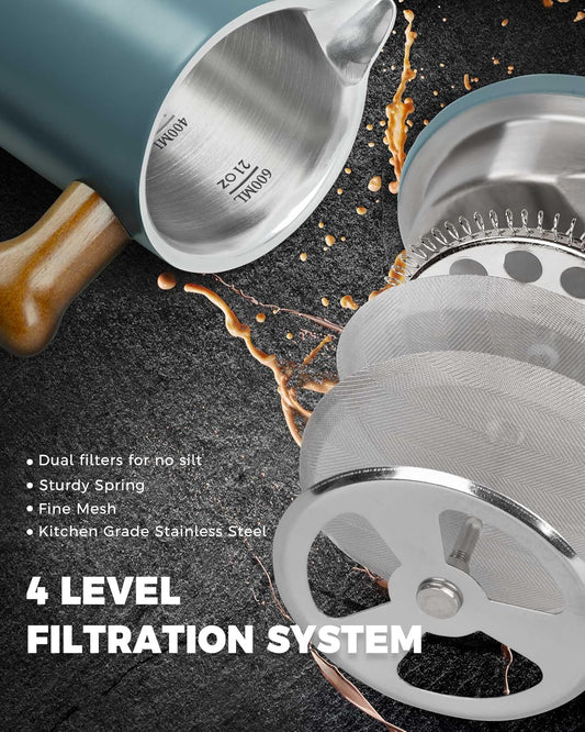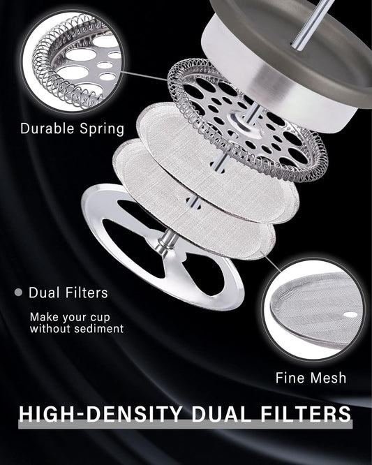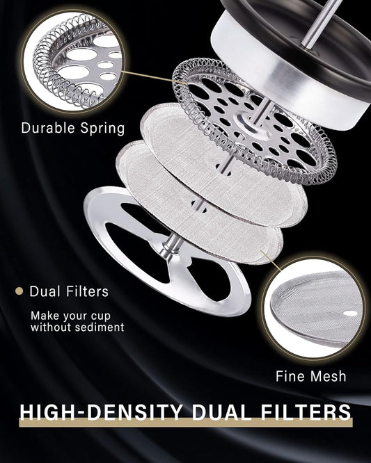 French Press Coffee Maker 304 Stainless Steel Coffee Press,with 4 Filters System, Heat Resistant Thickness Borosilicate French Press Glass, BPA-Free Brewed Tea Pot Coffee Plunger