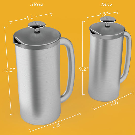French Press Coffee Maker - Insulated, Stainless Steel Manual Coffee Makers For Home, Office Or Camping - Large 34oz Capacity For 4 Cups