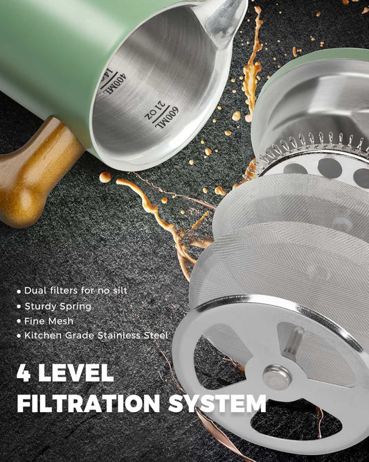 POLIVIAR French Press Coffee Maker, 21 oz Coffee Press with Real Wood Handle, Double Wall Insulation & Dual-Filter Screen, Food Grade Stainless Steel for Good Coffe and Tea, JX2024-SFPN