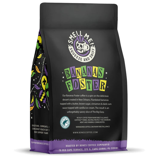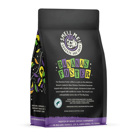 Bones Coffee Company Bananas Foster, Banana, Rum and Vanilla Flavored Coffee, Medium Roast Low Acid Arabica Beans Compatible with Auto drip and French Press Coffee Maker, 12 Oz Ground