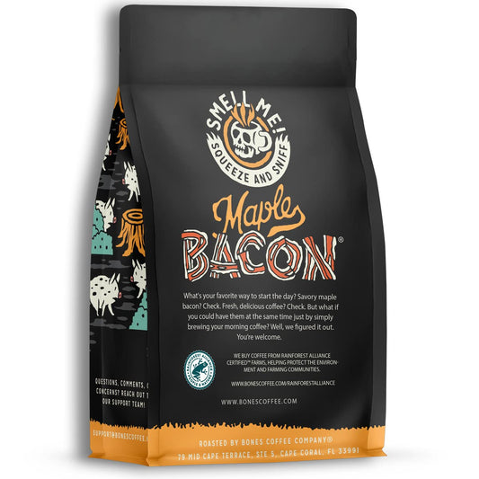Bones Coffee Company Maple Bacon, Bacon and Maple Syrup Flavored Coffee, Medium Roast Low Acid Arabica Beans Compatible with Auto drip and French Press Coffee Maker, 12 Oz Ground