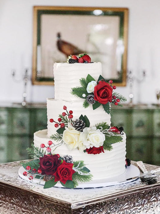 Rinlong 3Pcs Pre-made Cake Topper Cake Decorating Flowers for Christmas Cake Decor Burgundy Xmas Cake Decorations for Wedding Baptism