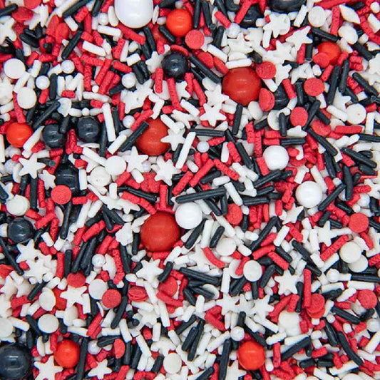 Red White and Black Sprinkles for Cake Decorating and Baking Cupcakes - Fancy Edible Red Sprinkles for Cookies with White Black Sprinkle Decorations in Jimmies, Nonpareils, Sugar Pearl with Star Quins