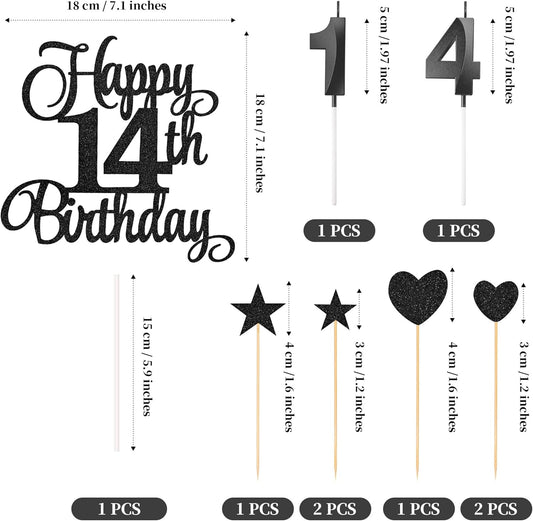 14th Birthday Cake Decorations, 14th Birthday Candles Cake Numeral Candles and Glitter Happy 14th Birthday Cake Toppers Set for Birthday Party Supplies (Black)