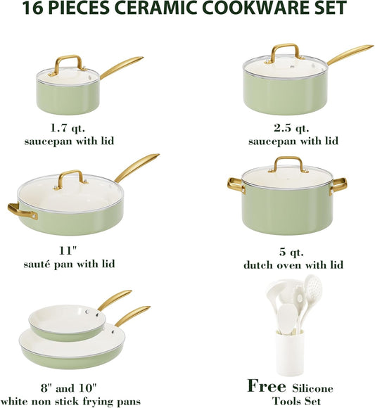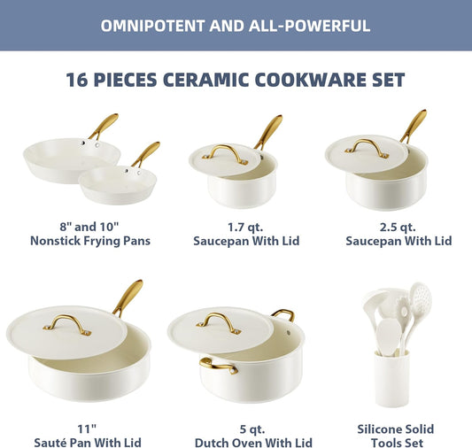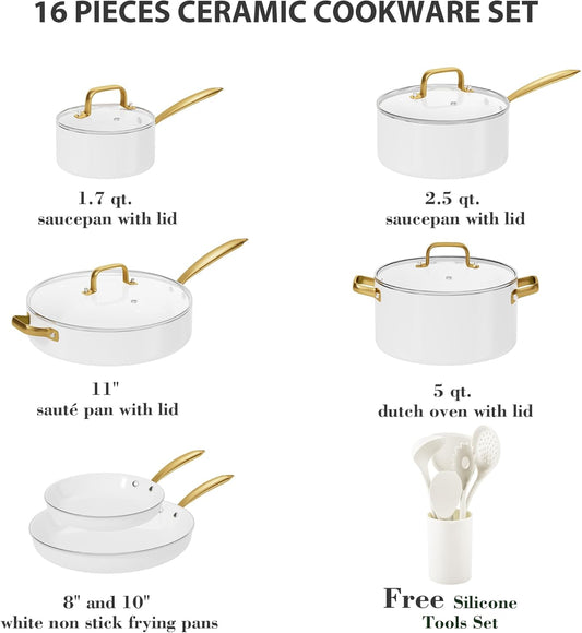 Ceramic Cookware Set, VONIKI 16 Pcs Pots and Pans Set Non Stick, Kitchen Cookware Sets with Cooking Utensils Set, Non Toxic Cookware Set White Gold Pan Set for Cooking Pot Oven & Dishwasher Safe, Gift