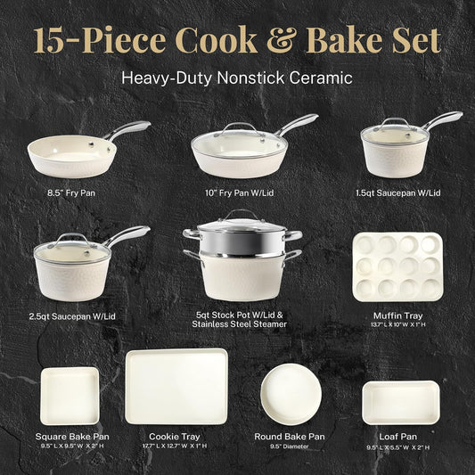 Gotham Steel Hammered 15Pcs Ceramic Cookware Set Nonstick, Induction Pots and Pans Set Non Stick with Bakeware Set & Steamer for Cooking, Non Toxic PFOA PFOS Free, Oven & Dishwasher Safe, Cream White