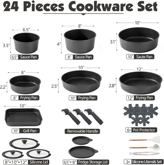 SENSARTE 24 Piece Pots and Pans Set, Nonstick Detachable Handle Cookware, Induction Kitchen Cookware Set with Removable Handle, Healthy Non Stick for RV, Dishwasher&Oven Safe (Black)
