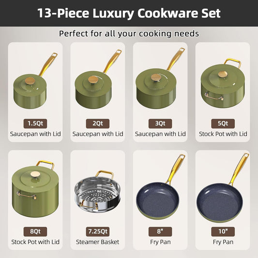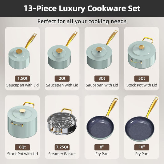 Nuwave Lux LE 13-Pc Cookware Set with Elegant Gold Handle, Diamond Infused Ceramic Non-Stick, PFAS Free, Premium Metal Lids, Ergonomic Stay-Cool Handles, Induction Ready & Compatible w/All Cooktops