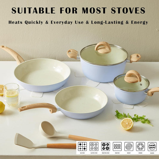 Blue Non Stick Pots and Pans Set, Healthy Ceramic Cookware Set, 12pcs Kitchen Cooking Pots and Frying Sauce Saute Pans Set, PFAS-Free with Kitchen Utensils and Lid