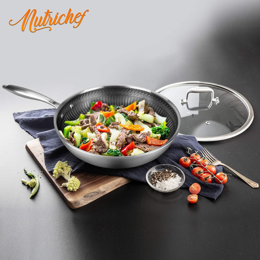 NutriChef 12" Stainless Steel Wok - Induction ready, Non Stick Tri-ply technology, Scratch-resistant Honeycomb Fire Textured Pattern