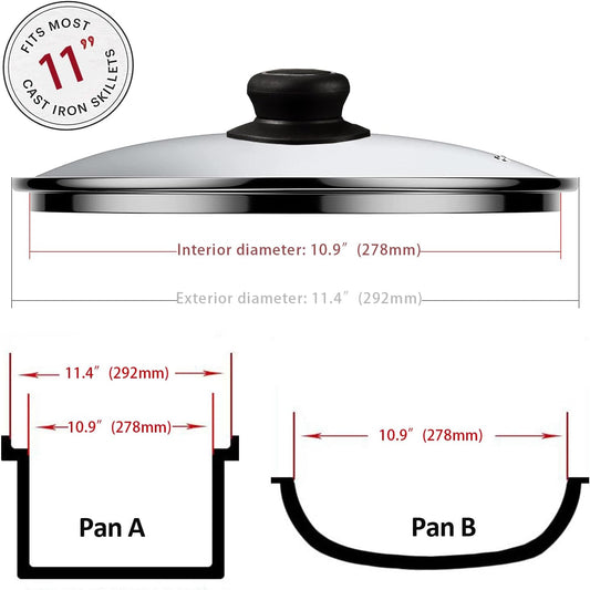 11 Inch Pan Lid Tempered Glass Pot Lid Replacement Glass Cover for 11" Cast Iron Skillets, Frying Pans, Pots and Wok, Heat Resistant Handle