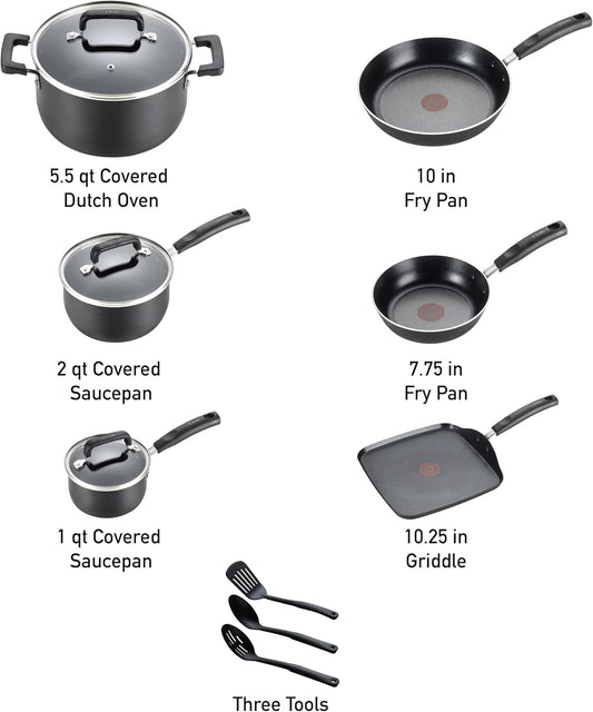 T-fal Ultimate Hard Anodized Nonstick Cookware Set 12 Piece, Oven Broiler Safe 400F, Lid Safe 350F, Kitchen Cooking Set w/Fry Pans, Saucepans, Dutch Oven, Pots and Pans, Dishwasher Safe, Black