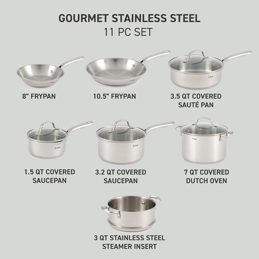 T-fal Stainless Steel Cookware Set 11 Piece, Induction, Oven Broiler Safe 500F, Kitchen Cooking Set w/Fry Pans, Saucepans, Saute Pan, Dutch Oven, Steamer, Pots and Pans, Dishwasher Safe, Silver