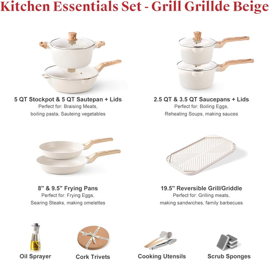 Caannasweis 20Pcs Cookware Sets, Nonstick Pots and Pans Set, Granite Induction Cookware, Non Stick Kitchen Cooking Set,Cream White 21 Piece Egg Pan Set, PFOS PFOA Free