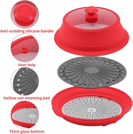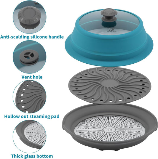 Microwave Splatter Silicone Cover Collapsible Steamer, Vented Multifunction Splash Lid with Glass Dish Bowl Plate for Food Cooking Bacon Maker, Dishwasher Safe BPA-Free 10.5 inch Cookware Set