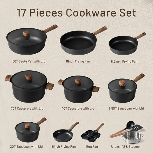 CAROTE Nonstick Kitchen Cookware Sets, Non stick Pots and Pans set, Induction Cookware Set 17pcs Black