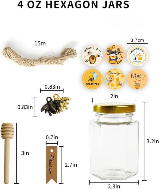 24 Pack 4oz Glass Hexagon Honey Jars Golden Lids - Extra Wooden Honey Dipper Sticks, Bee Charms, Tag String, Thank You Gift Tags, Stickers (Golden 24 Stickers)
