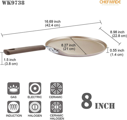 CHEFMADE Crepe Pan with Bamboo Spreader, 8-Inch Non-Stick Pancake Pan with Insulating Silicone Handle for Gas, Induction, Electric Cooker (Champagne Gold)