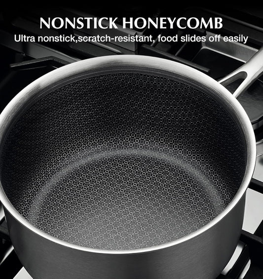 KOCH SYSTEME CS Hybrid Nonstick Stainless Steel Saucepan, 2 Quart Tri-Ply Stainless Steel Sauce Pan with Nonstick Honeycomb Interior, Hybrid Sauce Pan with Lid, Small Steel Pot, Induction Compatible