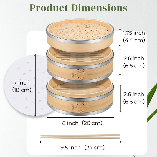 Flexzion Bamboo Steamer Basket Set (8 inch) with Stainless Steel Banding, 50 x Steamer Liners and 2 Pairs of Chopsticks, Steam Baskets for DimSum Dumplings, Rice, Vegetables, Fish and Meat