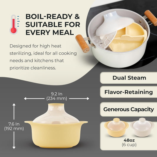 48oz Platinum Silicone 3 Compartmented Microwave Steamer Pot with Handle & Lid - Korean 100% Food-Grade Steamer Bowl, Heat-Resistant Cooker with Steam Holes, Easy Clean, Dishwasher Safe, Yellow