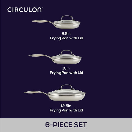 Circulon C1 Series Clad Stainless Steel with ScratchDefense Technology Cookware Nonstick Induction Frying Pans/Skillets with Lids, Metal Utensil Safe, 6 Piece Set - Polished Stainless Steel
