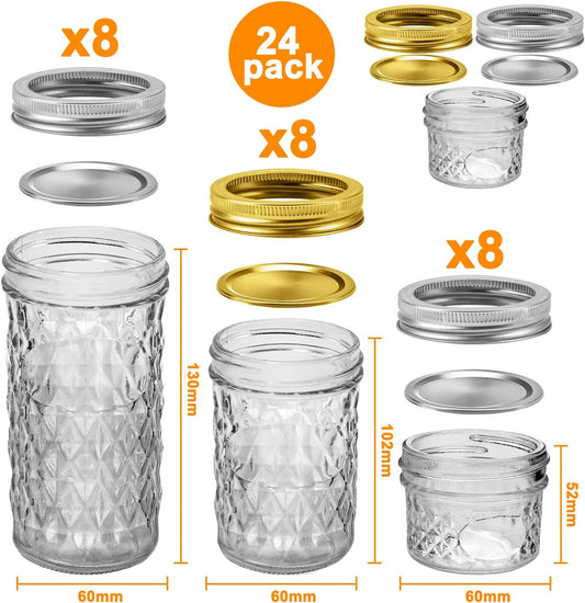 Mason Jars Canning Jars, 24 Pack Jelly Jars With Regular Lids, Ideal for Jam, Honey, Wedding / Shower Favors, DIY Magnetic Spice Jars - 4 OZ x 8, 8 OZ x 8, 12 OZ x 8 (4oz -8oz-12oz)