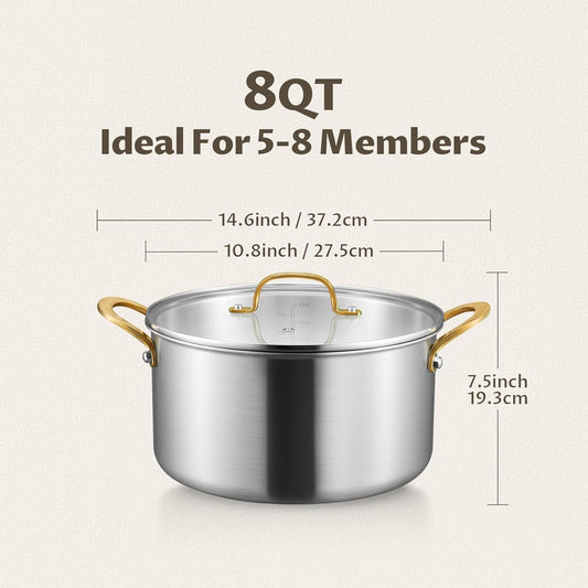 BEZIA 8 Quart Tri-Ply Stainless Steel Pot, Stockpot with Tempered Glass Lid, Exceptional Heat Distribution, Induction Pot, Induction Cooking Pot for All Stoves, Dishwasher Safe, Silver