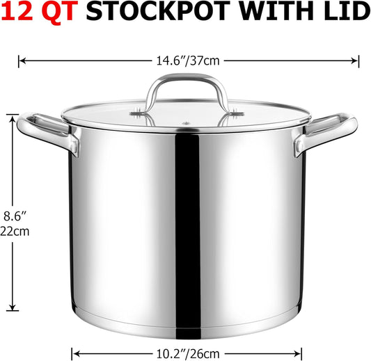 LIANYU 12 QT Stock Pot with Lid, 12 Quart Stainless Steel Large Tall Soup Pot for Cooking, Big Deep Stockpot with Visible Lid, Tri-ply Heavy Duty Stockpot for Induction, Stoves, Gas