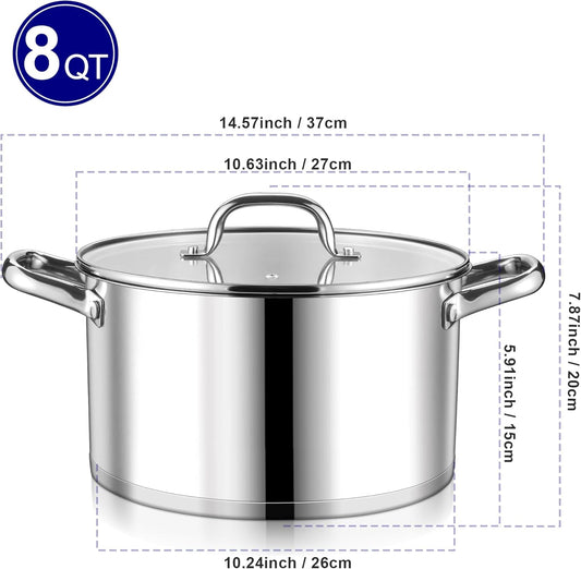 LIANYU Stainless Steel Stock Pot, 8 QT Large Soup Pot for Home Kitchen, Heavy Duty Cookware Compatible with Ceramic Gas Induction Cooktop, Dual Handles & Glass Lid, Dishwasher Safe